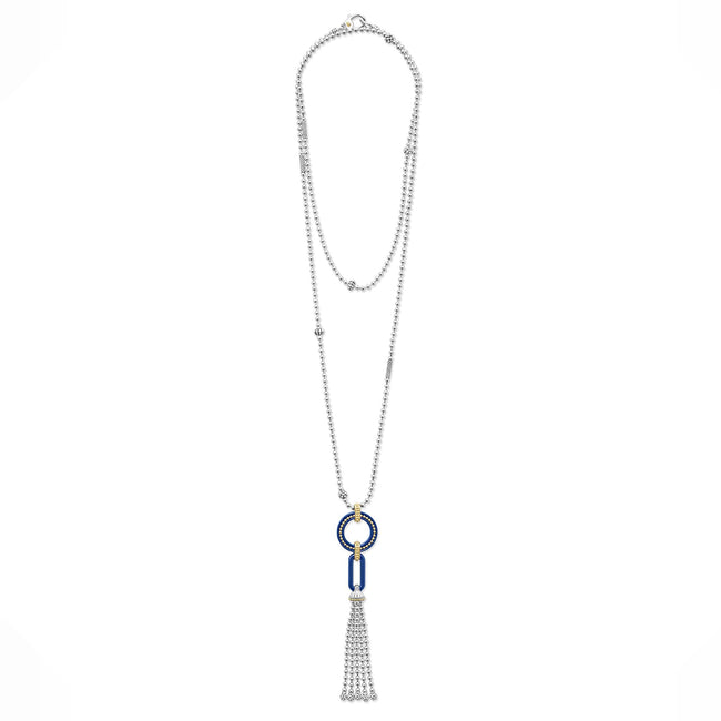 Limited quantities for a limited time! A LAGOS exclusive. An ultramarine ceramic tassel pendant with 18K gold and sterling silver Caviar beading forms this statement necklace.