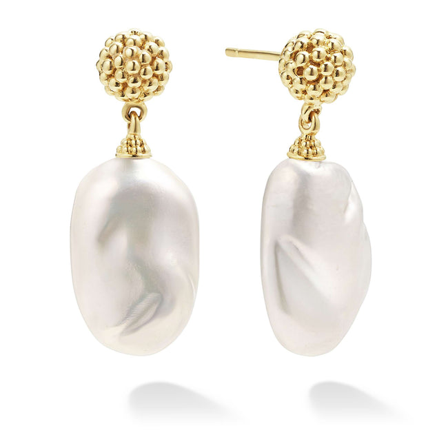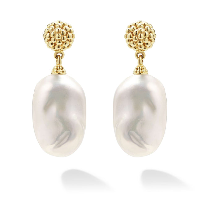 18K gold Caviar beading frame these cultured freshwater pearl baroque drop earrings.